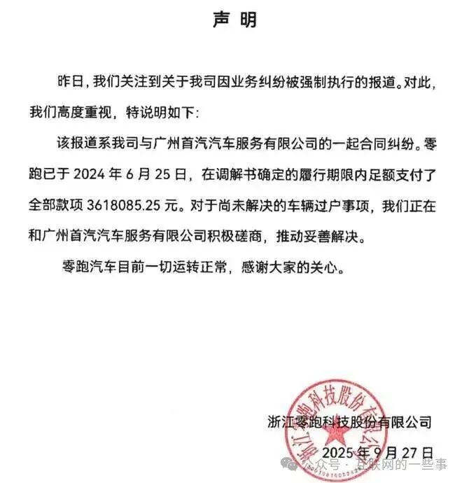 零跑方面宣称已在2024年6月25日,也便是妥洽书步调的履行期限内支付了全部款项。关联词,法院的推行信息炫耀,推行尺度运转于2025年,且认定其“有履行才调却拒不履行”。
