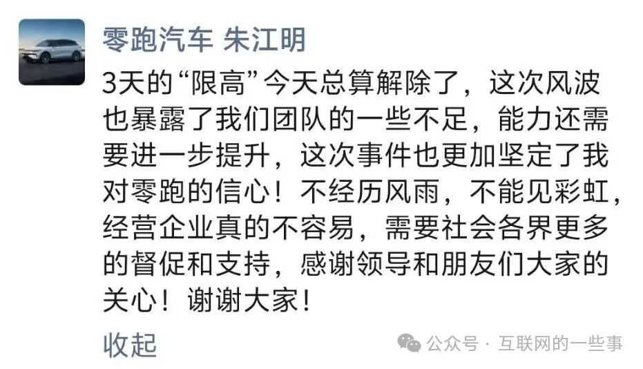 9月28日,零跑汽车首创东说念主朱江明在一又友圈发布复兴,阐明我方因被列为“限定高糟塌东说念主员”的风云已破除。