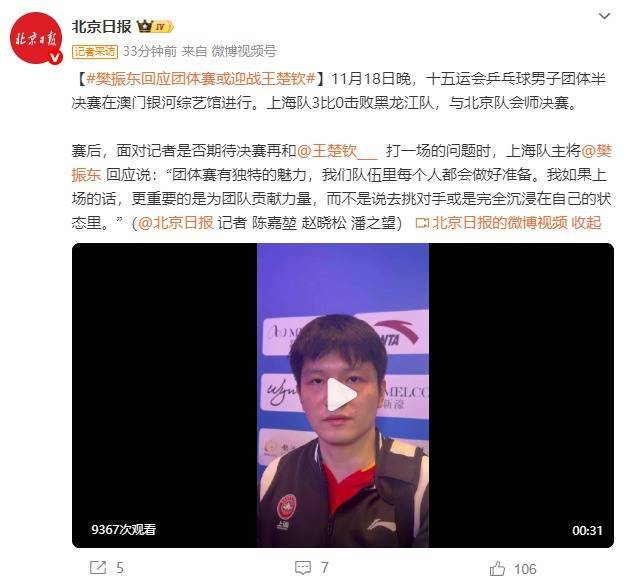 赛后,濒临记者是否期待决赛再和王楚钦打一场的问题时,上海队主将樊振东回话说:“团体赛有特有的魔力,咱们队伍里每个东说念主齐会作念好准备。我淌若上场的话,更紧迫的是为团队孝顺力量,而不是说去挑敌手或是完全千里浸在我方的景色里。”